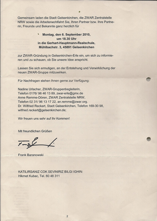 Am 6. September 2010 platzte die Aula der Gerhard-Hauptmann-Realschule fast aus allen Nähten. Man munkelte, das über 120 Menschen oder 150 oder so aus dem Stadtteil Erle dem Ruf gefolgt waren. Sie alle hatten ihre Wünsche, Fragen und Träume im Gepäck – und natürlich das Schreiben, das alles ins Rollen gebracht hatte.